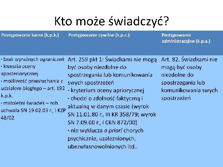 Specyfika Świadek Dowód podstawowy, najpowszechniejszy Strona Dowód (wyjaśnienia oskarżonego) niezbędny ze względu na gwarancje procesowe w k. p. k. Dowód drugoplanowy Dowód wyłącznie subsydiarny ze względu na trudną ocenę wiarygodności w k. p. c.