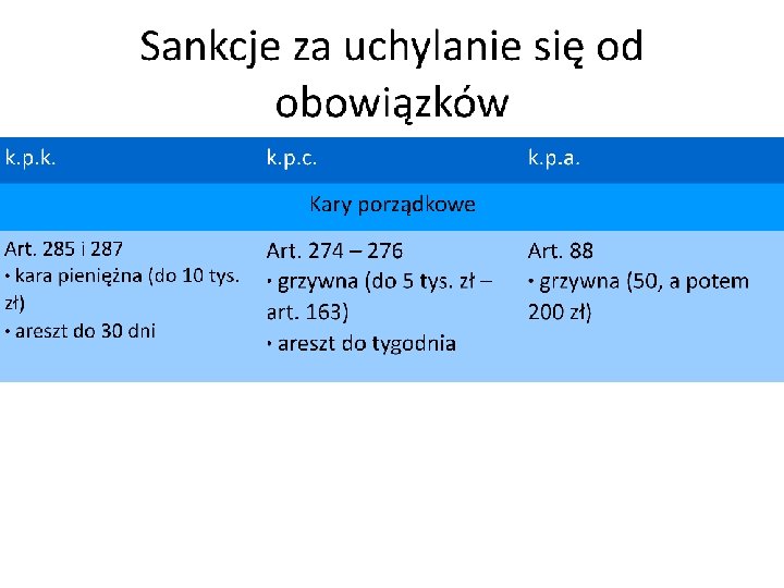 Wyjątki k. p. c. k. p. a. Zwolnienie z obowiązku stawiennictwa Art. 177 § 2 - choroba, kalectwo, inna nie dająca się usunąć przeszkoda Art. 177 § 1 a – przesłuchanie na odległość Art. 263 - choroba, kalectwo Art. 50 § 3 - choroba, kalectwo, inna nie dająca się usunąć przeszkoda Art. 235 § 2 przesłuchanie na odległość Zwolnienie z przyrzeczenia Art. 189 Art. 267 Brak przyrzeczenia (tylko pouczenie – art. 83 § 3 Zwolnienie z zeznań Art. 178 – 183, art. 185 Art. 259 - 261 Art. 82 – 83
