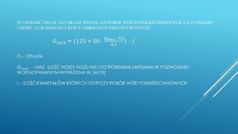 WYSOKOŚĆ OPŁAT ZA USŁUGI WODNE ZA WPROWADZANIE DO WÓD LUB DO ZIEMI ŚCIEKÓW Z CHOWU LUB HODOWLI RYB W OBIEKTACH PRZEPŁYWOWYCH: OPŁATA = S X (ŁŚ – ŁW - ŁD) GDZIE S – JEDNOSTKOWA STAWKA OPŁAT ZA 1 KG SUBSTANCJI [ZŁ/KG]; ŁŚ – ŁADUNEK SUBSTANCJI ZAWARTY W ŚCIEKACH [KG]; ŁW – ŁADUNEK SUBSTANCJI ZAWARTY W POBRANEJ WODZIE [KG]. ŁD – ŁADUNEK DOPUSZCZALNEGO WZROSTU STĘŻEŃ ŁŚ = V X S/1000 [KG] GDZIE: V – ILOŚĆ ŚCIEKÓW ODPROWADZONYCH W DANYM KWARTALE [M 3]; S – STĘŻENIE ZANIECZYSZCZEŃ W WODACH ODPROWADZANYCH: BZT 5, CHZT, ZAWIESINA OGÓLNA, [MG/DM 3]. ŁW = V X S/1000 [KG] GDZIE: V – ILOŚĆ WÓD POBRANYCH W DANYM KWARTALE [M 3]; S – STĘŻENIE ZANIECZYSZCZEŃ W WODACH POBRANYCH: BZT 5, CHZT, ZAWIESINA OGÓLNA, [MG/DM 3] W WODACH POBIERANYCH. ŁD = V X S/1000 [KG] GDZIE: V – ILOŚĆ WÓD POBRANYCH W DANYM KWARTALE [M 3]; S – STĘŻENIE ZANIECZYSZCZEŃ DOPUSZCZALNE, WYRAŻONE JAKO WARTOŚCI DOPUSZCZALNEGO WZROSTU WARTOŚCI STĘŻEŃ DLA POSZCZEGÓLNYCH PARAMETRÓW UJĘTE W TABELI Z PKT. 2: BZT 5, CHZT, ZAWIESINA OGÓLNA, [MG/DM 3] W WODACH POBIERANYCH.