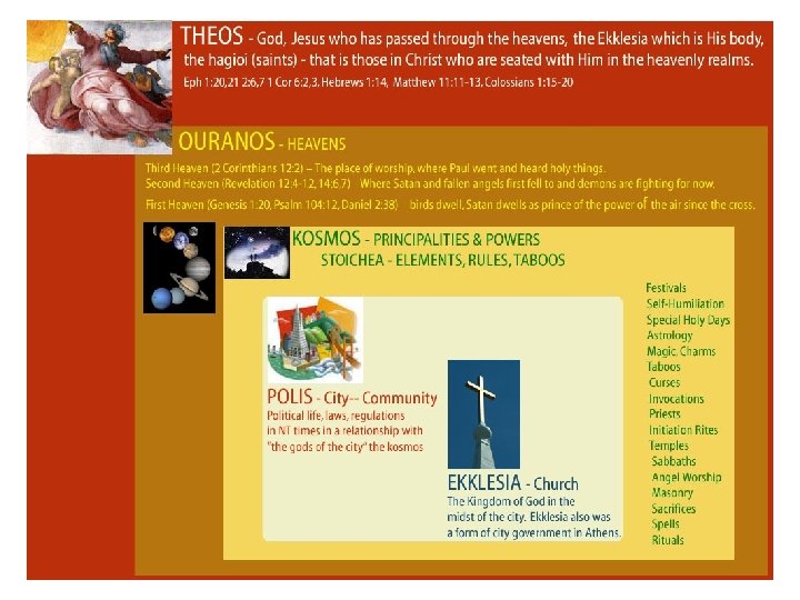 Stoichea • The “measured out things”, the “elements” • The rules of the “kosmos” - the spiritual rules, fears, rituals, human commandments, superstitions and ceremonies that keep people in spiritual bondage. • (Colossians 2: 8 -23, Galatians 4: 9, 10 • This or that is “taboo” • Community governed and kept in darkness • Overcome on the cross.