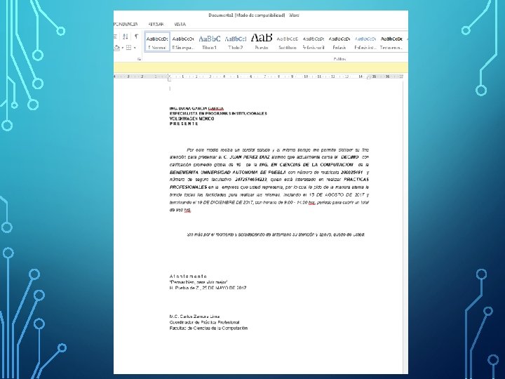 CARTA DE PRESENTACION DATOS REQUERIDOS • • • Nombre y Cargo de la persona a la que va dirigida. Dependencia Nombre del estudiante Matricula Carrera Nombre del Programa