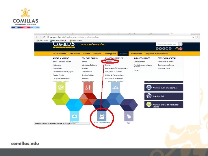 Vías para acceder a una práctica A través del Servicio de Prácticas 1. Todos los alumnos, con el primer cuatrimestre aprobado, deben darse de alta en la aplicación de prácticas (link) El alumno por su cuenta 1. Hacer, con una antelación mínima de 15 días, la solicitud de la práctica conseguida en: 2. El alumno recibe un mail con la confirmación de la solicitud. 3. El alumno recibe un mail con la autorización de acceso al servicio. 2. Una vez autorizado puedes subir el CV + completar los campos (estudios, idiomas, informática, …) y podrás acceder a las ofertas. El alumno recibe un mail con la confirmación de la solicitud recibida. 3. El alumno recibe un mail con la autorización de la práctica. Imprescindible para iniciar la práctica. 4. Se gestionan los documentos de prácticas (Convenio y anexo). 4. 5. El Servicio de Prácticas envía los CV a las ofertas en las que encaje su perfil sólo si el alumno ha aplicado. www. comillas. edu > Alumnos > Prácticas > ICADE Empresariales