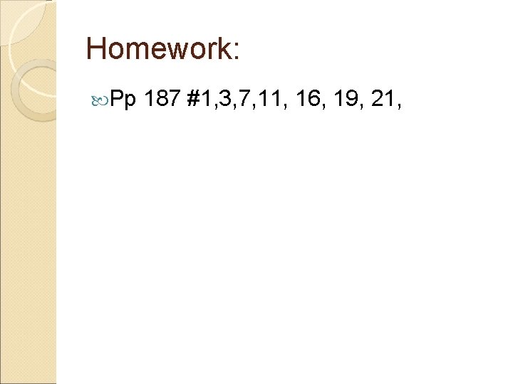 Homework: Pp 187 #1, 3, 7, 11, 16, 19, 21,