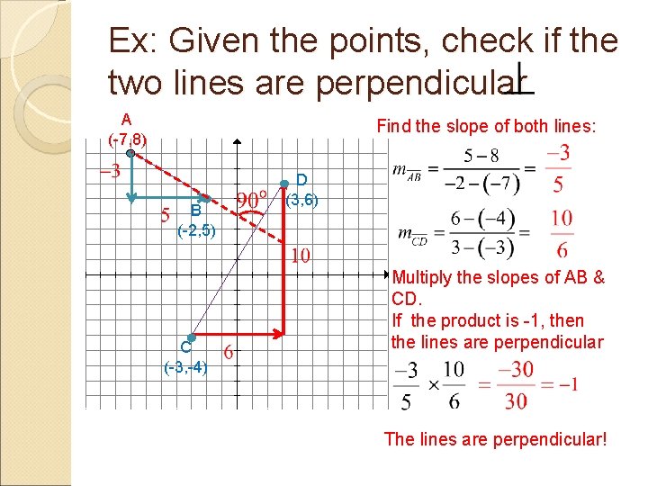 Ex: Given the points, check if the two lines are perpendicular A (-7, 8) Find the slope of both lines: B (-2, 5) C (-3, -4) D (3, 6) Multiply the slopes of AB & CD. If the product is -1, then the lines are perpendicular The lines are perpendicular!
