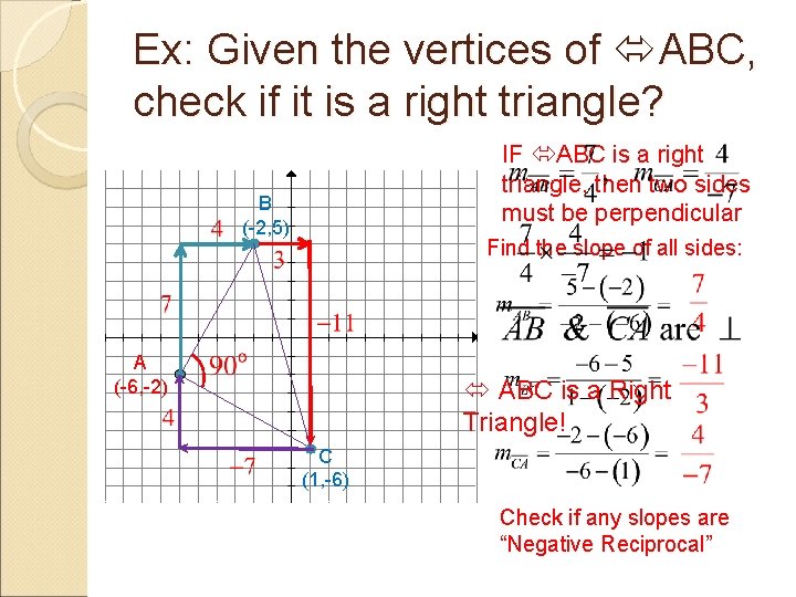 Ex: Given the vertices of ABC, check if it is a right triangle? IF ABC is a right triangle, then two sides must be perpendicular B (-2, 5) Find the slope of all sides: A (-6, -2) ABC is a Right Triangle! C (1, -6) Check if any slopes are “Negative Reciprocal”