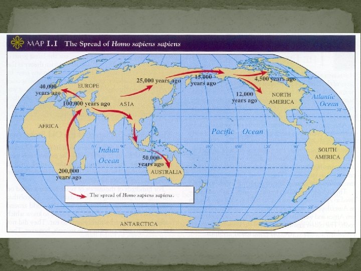 Homo sapiens �First anatomically modern humans �Named “wise, wise human” �Appeared in Africa between 200, 000 and 150, 000 years ago �Began to spread out of Africa about 100, 000 years ago �By 30, 000 BCE, they had largely replaced the mostlyextinct Neanderthals �By 10, 000 BCE, Homo sapiens could be found throughout the world