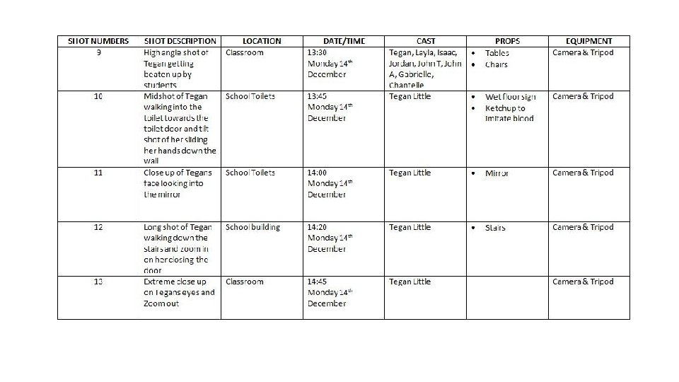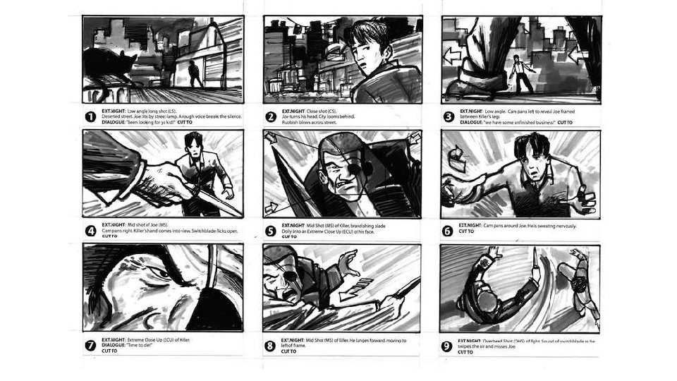 The Storyboard • Scene number is often written at the top of the sequence. • Shot number is often written underneath each frame. • Shot sizes are often written in block capitals underneath each frame and next to shot number. • The action in each scene is briefly described, usually in only one sentence. • Dialogue (if required) is written in the manner of a stage script. Characters’ names are usually given in capitals, and dialogue is written in lowercase. • Technical details about how the shot will be achieved may be required. This will include details about framing, lighting, camera movement and so on. • Sound effects are indicated last, usually in capitals.