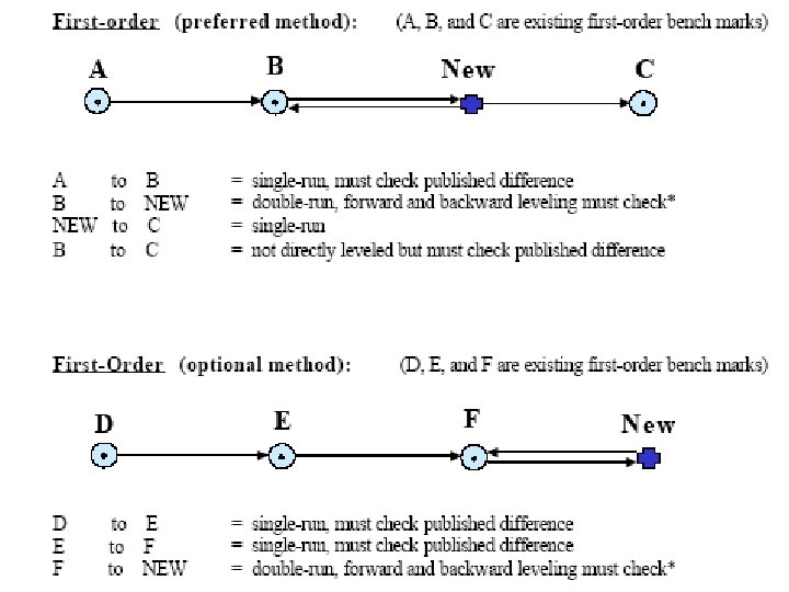 “ 1 st-order surveys are required to perform valid check connections to a minimum of six bench marks, three at each end. All other surveys require a minimum of four valid check connections, two at each end. ” FGCS Specifications and Procedures to Incorporate Electronic Digital/Bar-Code Leveling Systems