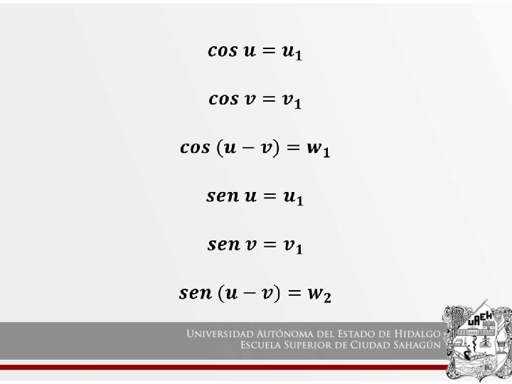 Sabiendo que los puntos (u 1, u 2), (v 1, v 2) y (w 1, w 2) están circunferencia unitaria U con centro en el origen, podemos sustituir 1 por cada una de: Al reducir se obtiene: