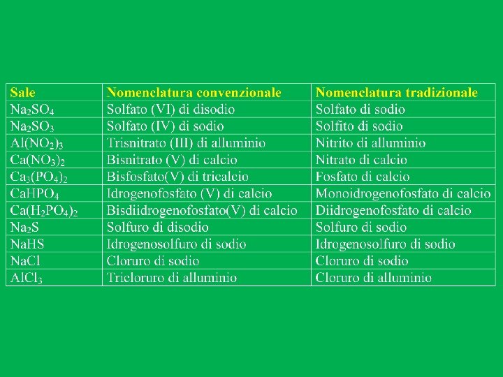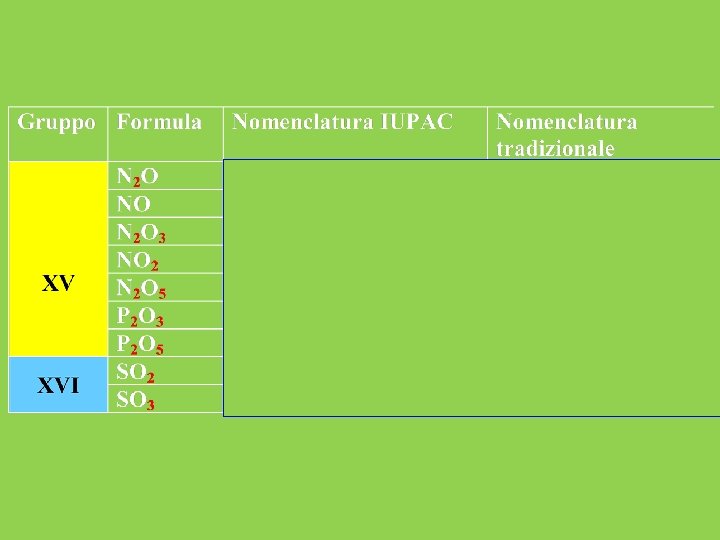 Nella nomenclatura tradizionale, se i numeri di ossidazione sono più di due si ricorre ai prefissi: -Ipo per il N. O. più basso -Per per il N. O. più alto n. o. +1 n. o. +3 n. o. +5 n. o. +7 n. o. +1 n. o. +5 n. o. +7