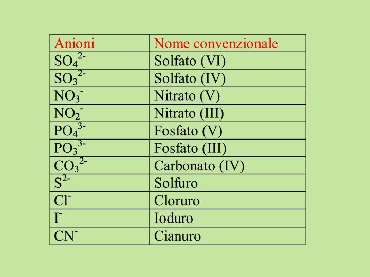 Ioni monoatomici Ioni positivi (CATIONI) IUPAC: Ione + nome del metallo + numero di ox tradizionale: suffisso –oso (n ox più basso) -ico (n ox più alto) IUPAC tradizionale