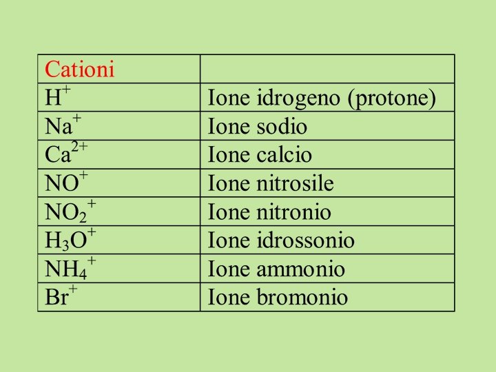 Ioni monoatomici Ioni negativi (ANIONI) Ione + nome dell’elemento+ desinenza -uro Eccezioni: