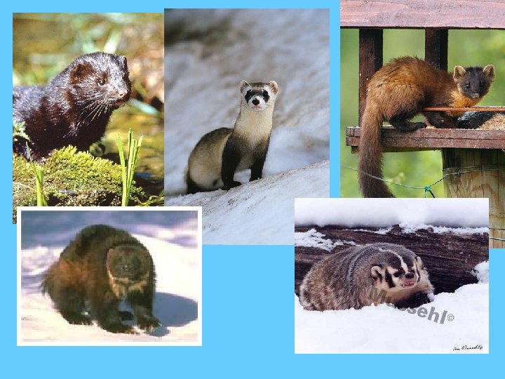 Weasels • Wolverines, minks, badgers, ferrets, martens, fisher, skunk • Can enter dens of many mammals they prey upon • Very efficient predators (sometimes thought to be the most vicious), aggressive • All living things are on the menu