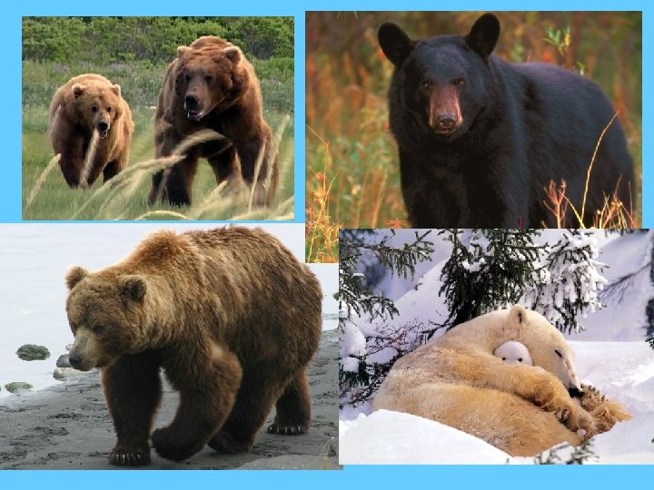 Bears • Largest and most well known predators in North America • Alaskan browns can get huge 4 -5 ft at the shoulder and up to 1500 lbs • Eat just about anything –berries, rodents fish - but will also eat carrion (rotted meat) • Black bear is most widely distributed