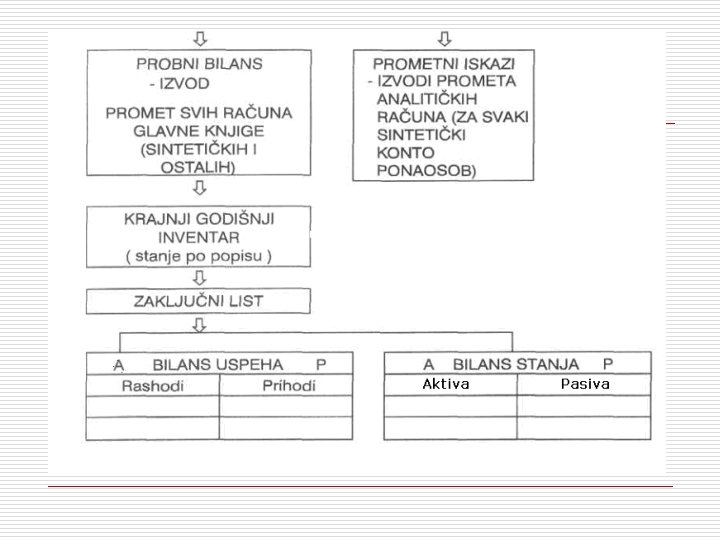 8. PREDZAKLJUČNA KNJIŽENJA o o Predzaključna knjiženja ili svođenje (konvertovanje) knjigovodstvenog na stvarno stanje predstavljaju postupke čiji je osnovni cilj dobijanje što kvalitetnijih (u smislu tačnosti, realnosti, pouzdanosti, potpunosti, blagovremenosti, . . . ) podataka za potrebe sastavljanja osnovnih finansijskih izveštaja - bilansa stanja i bilansa uspeha. Knjigovodstveno stanje sredstava, obaveza, rashoda i prihoda se utvrđuje na bazi knjigovodstvene evidencije, tj. salda odnosnih računa aktive, pasive, rashoda i prihoda.