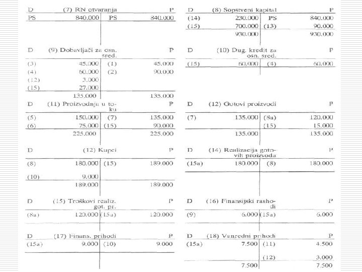 1. 4. 4. Glavna knjiga Primer broj 1. o o 1. 2. 3. 4. 5. 6. 7. 8. Preduzeće "STUDENT" iz Beograda počinje sa poslovanjem i raspolaže sledećim ulogom osnivača: Osnovna sredstva 240. 000 dinara, žiro račun 360. 000 dinara, blagajna 39. 000 dinara, materijal 120. 000 dinara, sitan inventar na zalihi 45. 000 dinara i ambalaža na zalihi 36. 000 dinara. Sastaviti početni bilans i proknjižiti sledeće poslovne promene preko računa glavne knjige: Kupljeno je na kredit materijala za 45. 000 dinara. Materijal je primljen i skladišten u magacin; Kupljena je na kredit mašina za 90. 000 dinara; Sa žiro računa je isplaćena obaveza za kupljen materijal na kredit; Iz odobrenog kredita za osnovna sredstva isplaćeno je dobavljačima za osnovna sredstva 60. 000 dinara na ime delimične otplate robnog kredita; Izdato je u proizvodnju materijala za 150. 000 dinara; Isplaćeno je sa žiro računa 75. 000 dinara na ime raznih troškova proizvodnje (LD radnika, strane usluge, kamate na kredite, poreze, doprinose isl); Završeno je i predato na skladištenje gotovih proizvoda za 135. 000 dinara; Prodato je na kredit gotovih proizvoda za 180. 000 dinara, stvarna cena koštanja (stvarni troškovi) prodatih proizvoda iznose 120. 000 dinara.
