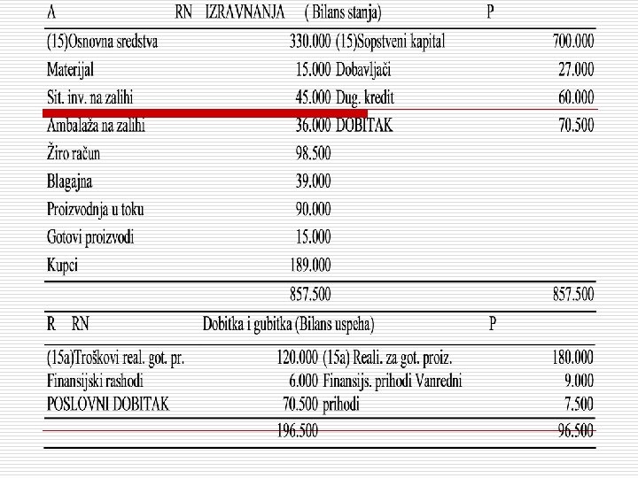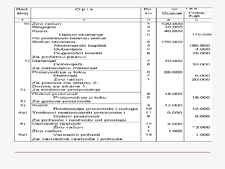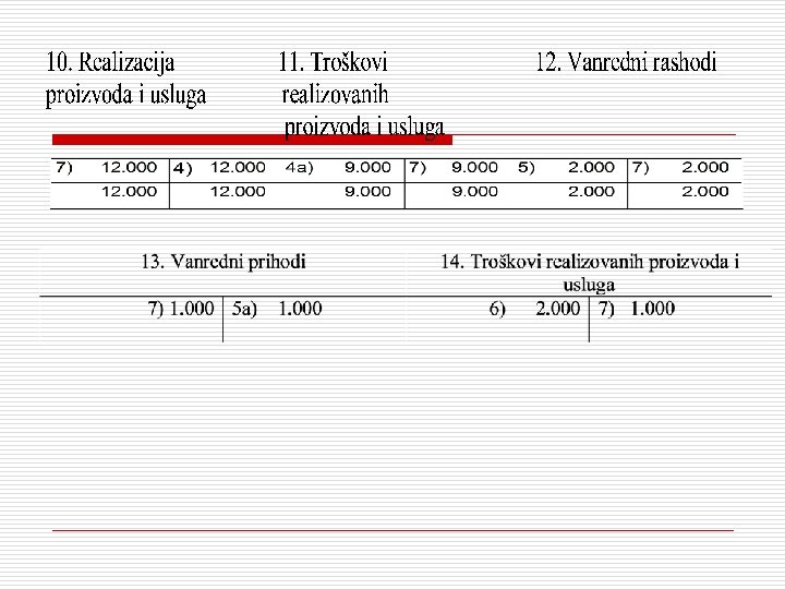 nastavak • • Polovina zaliha gotovih proizvoda je prodata na kredit za 12. 000 dinara; Preko žiro računa su isplaćeni vanredni rashodi u iznosu 2. 000 dinara i naplaćeni vanredni prihodi u iznosu 1. 000 dinara.