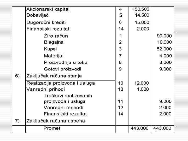 5. IZRADA PROBNOG LISTA ILI BILANSA o o o Probni bilans ili probni list predstavlja tabelarni pregled prometa i salda svih računa glavne knjige. On sadrži sledeće kolone: (1) redni broj, (2) naziv računa, (3) bruto bilans i (4) saldo bilans, a sastavlja se mesečno ili tromesečno. Bruto bilans sadrži početno stanje i zbir (tekući promet) dugovne i potražne strane svih računa glavne knjige. On služi za potrebe kontrole aritmetičke tačnosti izvršenih knjiženja, jer zbir dugovnih strana svih računa glavne knjige treba da je identičan zbiru potražnih strana svih računa glavne knjige. Pored toga podaci o prometu računa glavne knjige sadržani u bruto bilansu se koriste za potrebe analize.