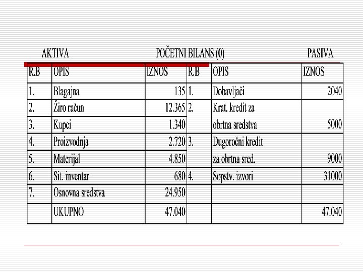 Akcionarski kapital 132. 000 dinara, dobavljači za osnovna sredstva 36. 000, blagajna 10. 120, materijal 50. 000, kratkoročni kredit za obrtna sredstva 10. 000, osnovna sredstva 103. 000, žiro račun 50. 000, dobavljači za obrtna sredstva 26. 000, gotovi proizvodi 22. 000, dugoročni kredit za osnovna sredstva 45. 000, gorivo i mazivo 2. 000, sitan inventar 4. 200, proizvodnja u toku 30. 000, kupci 22. 000, kratkoročni kredit za osnovna sredstva 11. 000, dugoročni kredit za obrtna sredstva 33. 000, (zbir aktive - zbiru pasive od 293. 320 dinara). o Grupisanje bilansnih pozicija izvršiti po principu rastuće likvidnosti (u aktivi) i principu opadajuće dospelosti (u pasivi);