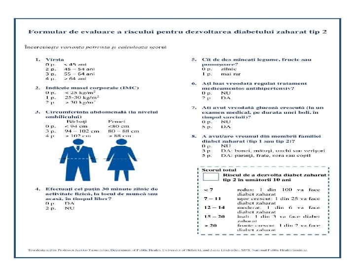 MIHAI 46 ani, contabil CA- 90 cm IMC – 23 kg/m 2 TA- 120/80 mm. Hg Matusa – DZ 2 Mod sedentar PETRU 53 ani, sofer CA- 120 cm IMC – 36 kg/m 2 TA- 150/90 mm. Hg Tata – DZ 2 Mod sedentar ION 58 ani, profesor CA- 100 cm IMC – 32 kg/m 2 TA- 140/90 mm. Hg Practica sportul 7 p 15 p 10 p Testul de toleranță la glucoză – la persoanele cu risc înalt și foarte înalt (>14 p)