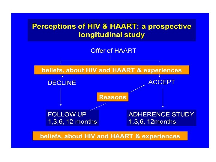 HAART adherence (6 months) predicted by baseline (pre-treatment) beliefs LOW ADHERENCE HIGH ADHERENCE At 6 Months 40. 9% classified as low adherence Low adherence predicted by BASELINE - necessity beliefs OR = 2. 19, 95% CI: 1. 02 to 4. 71, p=0. 045 - concerns about adverse effects OR= 0. 45, 95% CI: 0. 22 to 0. 96, p=0. 038 These relationships remained significant after controlling for age, previous experience of antiretrovirals and depression Horne R, et al JAIDS. (2007) , 45(3): 334 -341