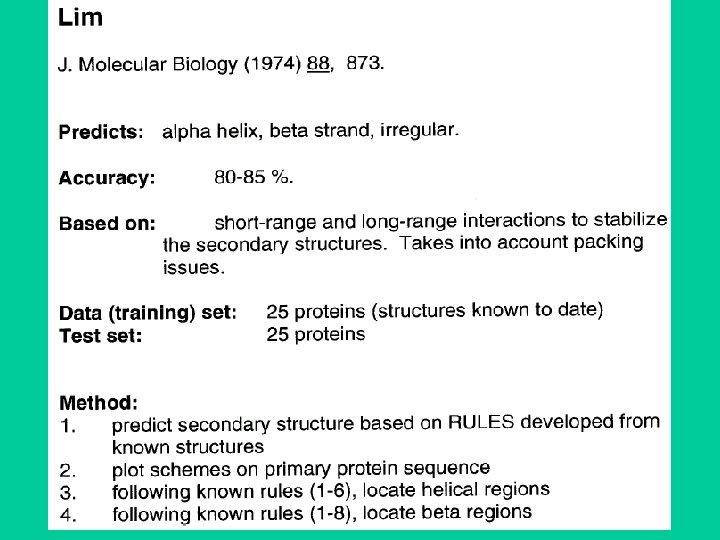 PSIPRED • Uses multiple aligned sequences for prediction. • Uses training set of folds with known structure. • Uses a two-stage neural network to predict structure based on position specific scoring matrices generated by PSI-BLAST (Jones, 1999) – First network converts a window of 15 aa’s into a raw score of h, e (sheet), c (coil) or terminus – Second network filters the first output. For example, an output of hhhhehhhh might be converted to hhhhh. • Can obtain a Q 3 value of 70 -78% (may be the highest achievable)