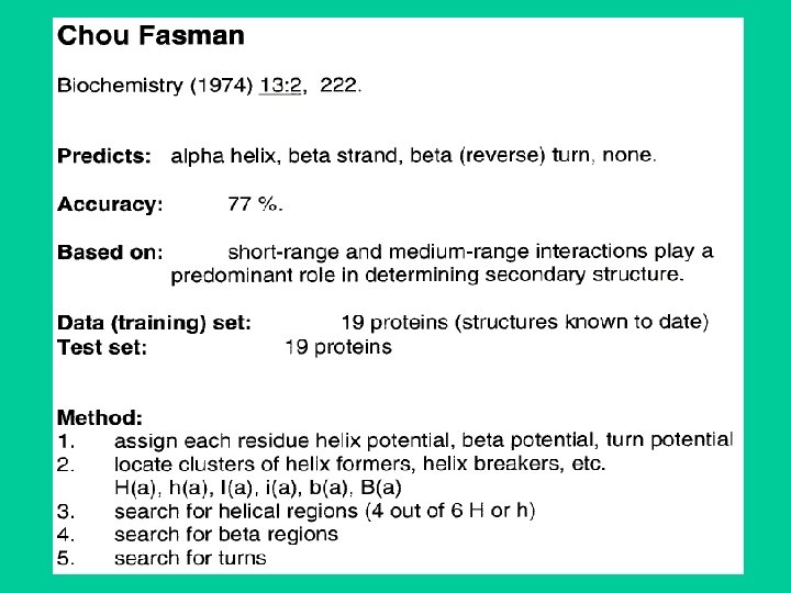 Chou-Fasman • First widely used procedure • If propensity in a window of six residues (for a helix) is above a certain threshold the helix is chosen as secondary structure. • If propensity in a window of five residues (for a beta strand) is above a certain threshold then beta strand is chosen. • The segment is extended until the average propensity in a 4 residue window falls below a value. • Output-helix, strand or turn.