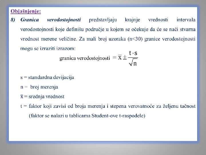 Objašnjenje: Vrednosti Student-ove t-raspodele n 2 3 4 5 10 20 30 90% 2. 920 2. 353 2. 132 2. 015 1. 812 1. 725 1. 697 95% 4. 303 3. 182 2. 776 2. 571 2. 228 2. 086 2. 042 99% 9. 925 5. 841 4. 604 4. 032 3. 169 2. 845 2. 750 99. 9% 31. 596 12. 941 8. 610 6. 869 4. 587 3. 850 3. 646 n = n-1 (stepen slobode)