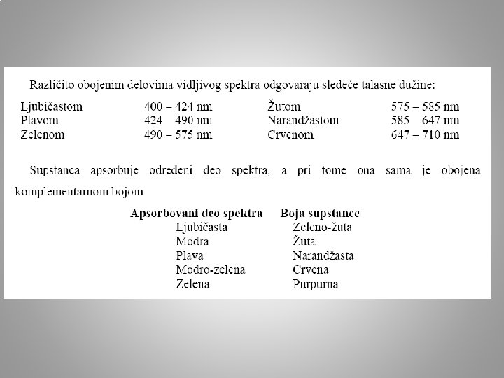 • Apsorpcija svetlosti određene talasne dužine dovodi do različitog obojenja supstance. Boja supstance koju uočava ljudsko oko komplementarna je boji koju ta supstanca apsorbuje. Odstupanje se javlja kod bele i crne boje. Bela boja se javlja kada supstanca reflektuje celokupnu količinu svetlosti koja padne na nju, a crna kada se kompletna količina svetlosti apsorbuje. Slika 5. Boja koju ljudsko oko uočava