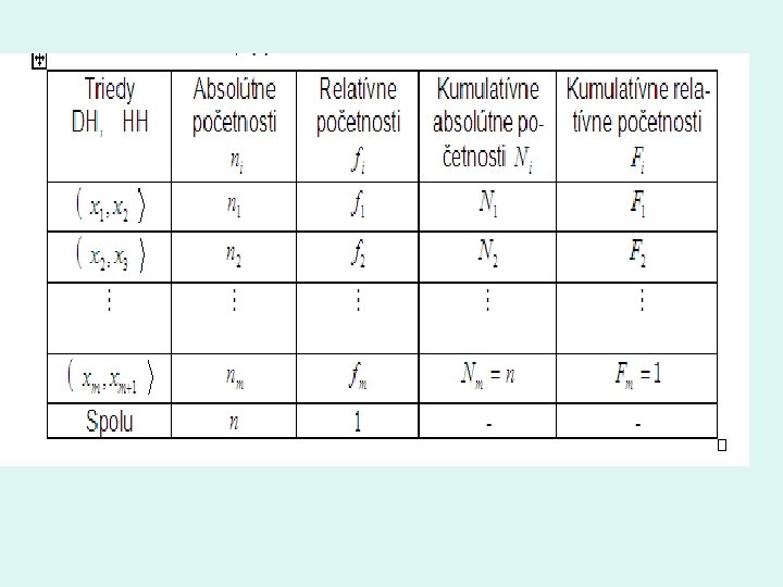 Intervalové rozdelenie početností • Použijeme ho vtedy, keď triediaci znak je diskrétny s veľkým počtom obmien, (tj. : počet obmien je väčší ako 20) • a vždy pre znak spojitý Počet intervalov (m) Rozpätie intervalu (h) Dolnú hranicu prvého intervalu (x 1 D)