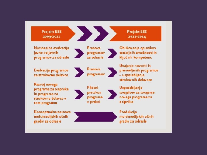 EVALVACIJA KONSENZUALNA VALIDACIJA TERENSKA RAZISKAVA 3 ŠTUDIJE NAČRT ZBIRANJE IN ANALIZA PODATKOV STROKOVNA IZHODIŠČA ZA PRENOVO STROKOVNE PODLAGE ZA PRENOVO IN RAZVOJ PODROČJA KONSENZUALNA VALIDACIJA SCENARIJI ZA UČNA GRADIVA ZA UDELEŽENCE PRENOVA NOV (KRATEK) PROGAM ZA OSIPNIKE MODEL PRENOVLJENIH PROGRAMOV KONSENZUALNA VALIDACIJA ZAKLJUČNA KONFERENCA ZAKLJUČEK PROJEKTA PRENOVA