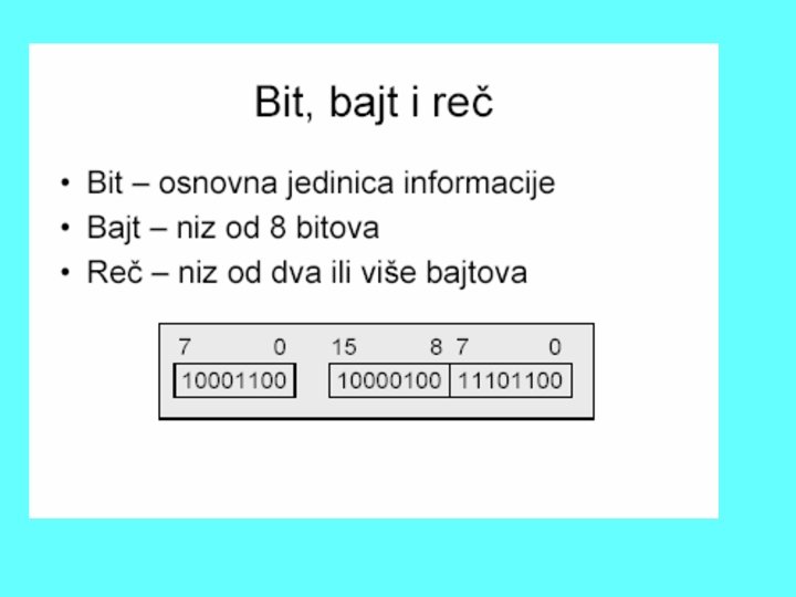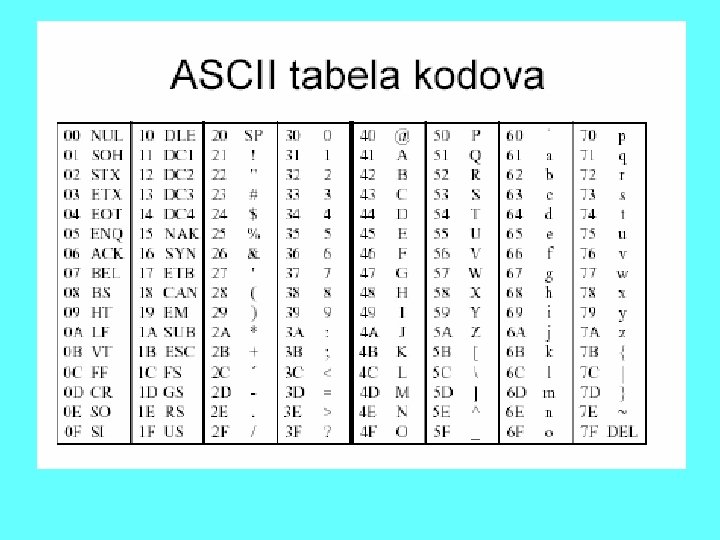 • Bitovi se u memoriji udružuju u grupe (registre), koji su kod personalnih računara duzine 8 bita. • Ovakva grupa zove se bajt. • Stanje svakog bita je signal za računar i 8 bita može imati 256 razlicitih kombinacija nula i jedinica, pa tako jedan bajt može predstavljati 256 različitih znakova u zavisnosti od kombinacije uskladištene u njemu. • Koja kombinacija predstavlja koji znak definiše se tabelom koja se zove kod. • Najčešće su u upotrebi ASCII (American Standard Code) kod • i ponekad EBCDIC (Extended Binary Coded Decimal Interchange Code)