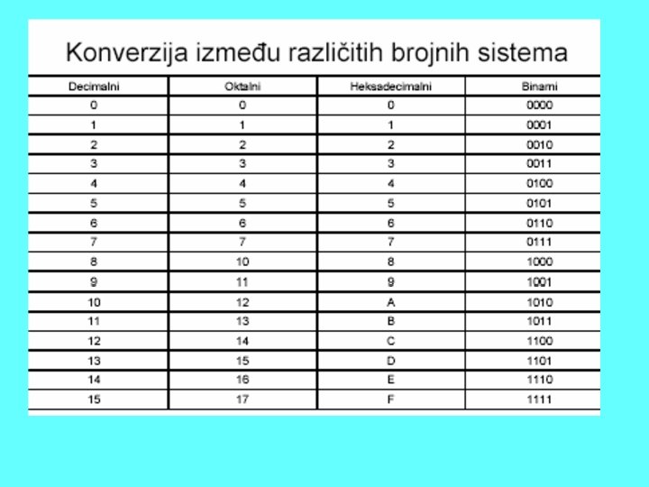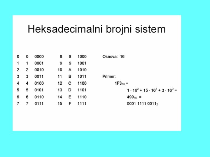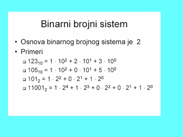 Sve što postoji od podataka u računaru, tamo stoji u vidu brojeva. • Svako slovo teksta koji je otkucan, • Svaki ton pesme koja je snimljena, • Svaka tačkica (pixel) slike koja je na ekranu. U našim računarima to su brojevi iz binarnog brojnog sistema, mada ne mora da bude tako, postoje računari koji rade u drugim brojnim sistemima. Dakle, svaki podatak koji računar ima u sebi predstavljen je brojem.