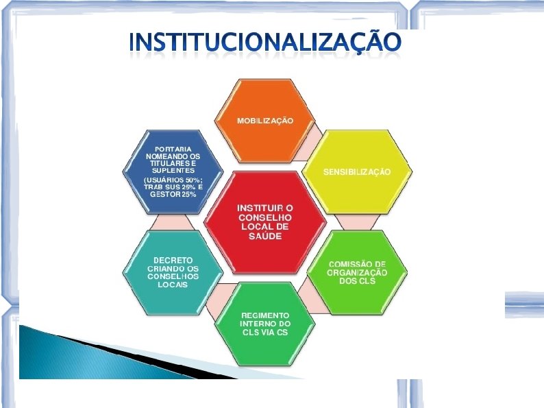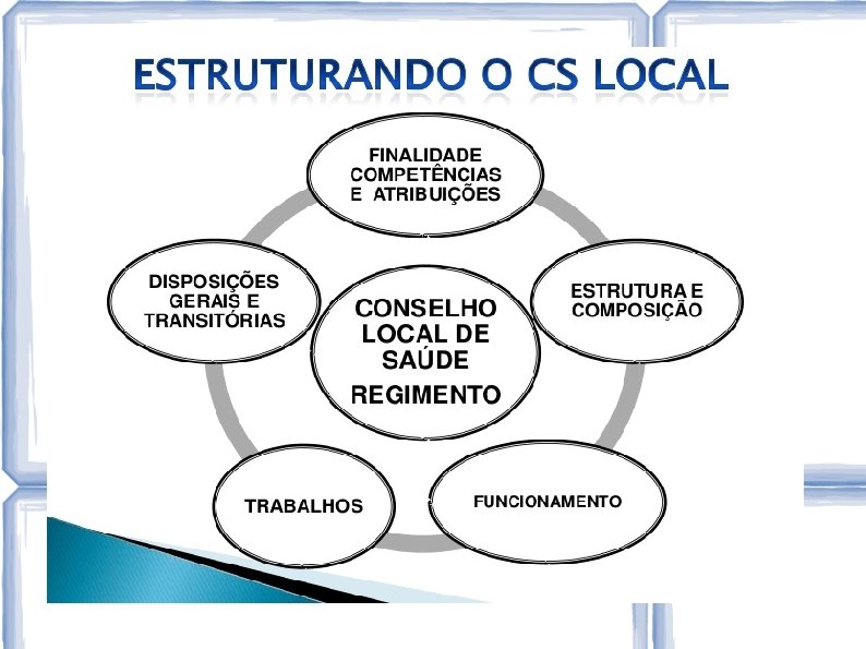 MOBILIZAÇÃO, SENSIBILIZAÇÃO E INSTITUCIONALIZAÇÃO DO CLS 1. Identificação e mobilização das lideranças e entidades de usuários da área de abrangência; 2. Realização de oficinas de sensibilização com a comunidade e profissionais quanto à importância da participação da comunidade na organização dos serviços de saúde e do processo de implantação do CLS; 3. Elaboração de regimento interno do CLS; 4. Planejamento e organização do processo eleitoral conforme orientações municipais; 5. Definição da comissão provisória eleitoral e do cronograma; 6. Realização da eleição dos representantes para a composição do CLS; 7. Publicação da Lei/Portaria/Decreto Municipal do Secretário/Prefeito Municipal; 8. Conselho Local de Saúde implantado e atuante, com cronograma de reuniões ordinárias definido.