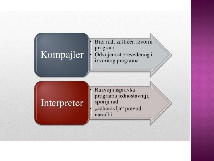 � Kompajlerski (translator se ne nalazi u operativnoj memoriji, brzi, zauzimanju manje prostora) � Interpretatorski(translator se nalazi u operativnoj memoriji, sporiji je, zauzima vise prostora, dobar je za ucenje programiranja)