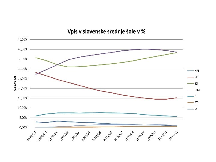 Pregled vpisa Šol. let. 1998/99 1999/00 2000/01 NPI 3020 2741 3439 SPI SSI GIM PTI 29989 38070 29026 6298 27867 36018 31265 7285 25629 33576 33628 7763 PT 65 97 95 MT 68 182 378 106536 105455 2001/02 3012 23812 31987 35794 7811 193 621 103230 2002/03 2785 22211 32120 37179 7592 218 1073 103178 2003/04 2556 20614 32599 38082 7805 260 1287 103203 2004/05 2247 19046 32736 38352 7773 293 1445 101892 2005/06 1902 17664 32598 38413 7428 309 1546 99860 2006/07 1630 15939 32078 37810 7047 343 1428 96275 2007/08 1320 14381 31300 36425 6564 376 1257 91623 2008/09 1125 13139 30929 35126 5693 372 1134 87518 2009/10 1052 12361 30910 33861 5273 406 1192 85055 2010/11 875 11900 30688 32432 4839 429 1083 82246 2011/12 836 12524 31674 31864 4642 317 791 82648 % -72, 3 387, 7 1063, 2 -58, 2 -16, 8 9, 78 26, 3 Skupaj 104508 Vir: Centralne obdelave, MIZKS 2012