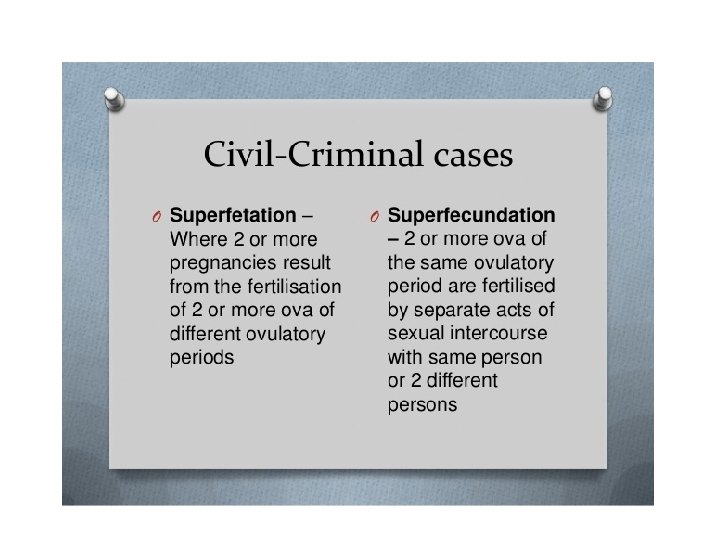 Medicolegal importance of pregnancy • In Civil cases: • Nullity of marriage • Inheritance of property • Higher maintenance allowance in case of divorce • Compensation cases • Illegitimate baby • Maternity leave • Compensation case if allegation of pregnancy against unmarried woman or widow.
