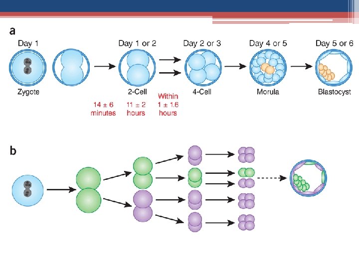 Embryonic Development • immediately after zygote formed chromosomes duplicate & cell prepares for mitosis ▫ 1 st mitotic division ~36 hrs ▫ 2 identical cells called blastomeres • initially mitosis repeated w/out cell growth developing very small cells with high surface-tovolume ratios • ~72 hrs: loose collection of cells forming a berryshaped cluster of 16 or more cells = morula