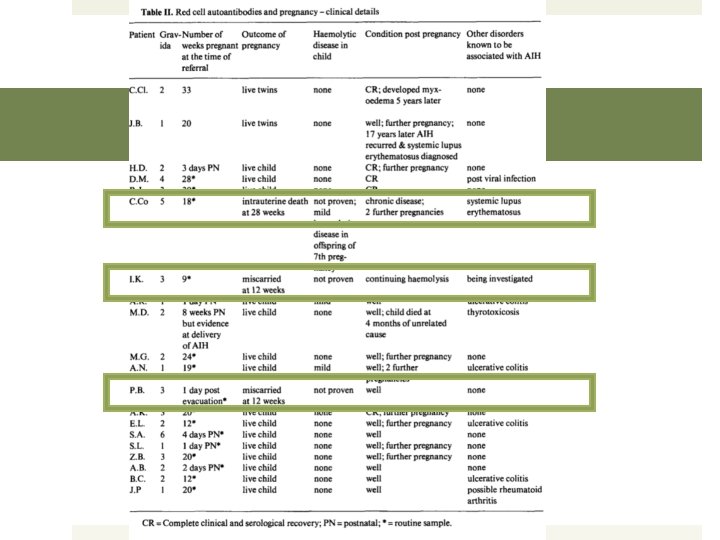 Chaplin et al. Life-threatening anemia in nearly 50% of mothers Hb <5 g/d. L: 9 patients Hb 5 -8 g/d. L: 8 patients Leukopenia: 4 patients Thrombocytopenia: 3 patients Vigorous transfusion therapy, high dose steroids +/- labor induction were employed as life-saving measures for critically ill patients Hemolysis worsened as pregnancy progressed in 18/19 patients Complete or partial remission occurred in 16 patients within 3 months postpartum 2 subsequently diagnosed with SLE