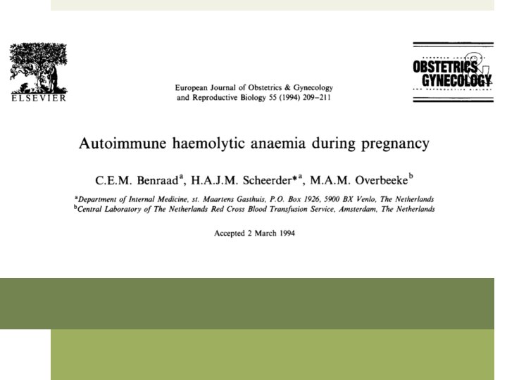 References Benraad CEM, Scheerder HAJM, Overbeeke MAM. Autoimmune haemolytic anaemia during pregnancy. Eur J of Obstetrics and Gynecolgoy (1994)55: 209 -211. Chaplin H, Cohen R, Bloomberg G, et al. Pregnancy and idiopathic autoimmune haemolytic anaemia: a prospective study during 6 months gestation and 3 months post-partum. Br J Haematol (1973)24(2): 219229. Grigoriadis D, Tympa A, Liapis A, et al. Alpha-Methyldopa-Induced Autoimmune Hemolytic Anemia in the Third Trimester of Pregnancy. Case Reports in Obstetrics and Gynecology(2013): 1 -2 Hoppe B, Stibbe W, Bielefeld A, et al. Increased RBC autoantibody production in pregnancy. Transfusion (2001); 41: 1559 -1561. Kumar R, Advani AR, Sharan J, et al. Pregnancy induced hemolytic anemia: an unexplained entity. Ann Hematol (2001)80: 623 -626. Murphy WG and Kelton JG. Methyldopa-induced autoantibodies against red blood cells. Blood Reviews (1988)2: 36 -42. Ong M, Hawthorne L. Autoimmune Hemolytic Anemia in Pregnancy. Lab. Medicine (2010)42(5): 264 -266. Semple JW and Freedman J. Autoimmune Pathogenesis and Autoimmune Hemolytic Anemia. Seminars in Hematology (2005)42: 122 -130. Sokol RJ, Hewitt S, Stamps B. Erythrocytes Autoantibodies, Autoimmune Hemolysis and Pregnancy. Vox Sang (1982)43: 169 -176. Valent P and Lechner K. Diagnosis and treatment of autoimmune haemolytic anaemias in adults: a clinical review. Wien Klin Wochesnschr (2008)120/5 -6: 136 -151.