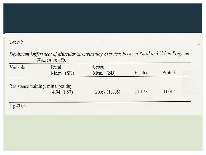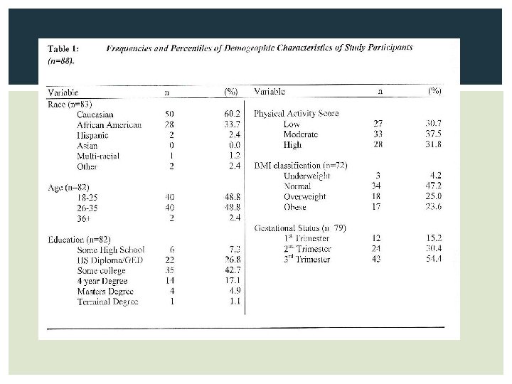 PHYSICAL ACTIVITY LEVELS • No difference in total physical activity among trimesters (p>0. 05) but significant differences found by geographical location (p<0. 05). • Pregnant women in urban areas were more likely to report higher levels of moderate activity (as reported by mins/day) and higher levels of resistance training. • Higher scores on physical activity were related to normal BMI, second trimester, and Caucasian race.