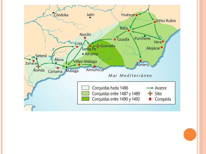 LA GUERRA DE GRANADA Reino Nazarí de Granada: Último reino musulmán en la Península. Causas de su supervivencia. � Reino vasallo de Castilla. � Pago de parias a Castilla. La Guerra de Granada (1487 -1492) � Iniciativa de los RRCC. Objetivo: Unificación religiosa y afianzamiento del poder real (monarquía autoritaria). � Conquistas destacadas: Málaga (1487) y Baza (1489). � Los RRCC aprovechan la inestabilidad política interna (luchas por el poder) Muley Hacen vs Boabdil el Chico � Capitulaciones de Granada (noviembre 1491) � Entrada de los RRCC en Granada (2 de enero 1492) Simbolizan el fin del proceso de reconquista.