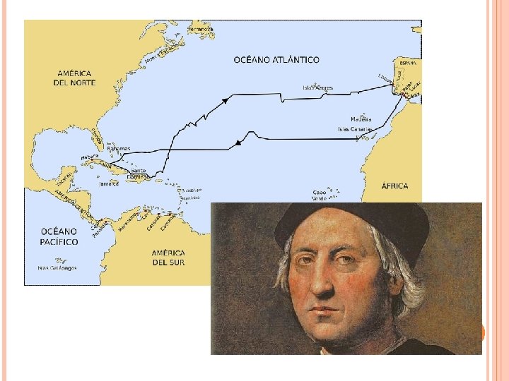 DESCUBRIMIENTO DE AMÉRICA Causas Búsquedas de rutas a Oriente tras la caída de Constantinopla (Imp. Bizantino). � Propuesta del marino Cristóbal Colón para alcanzar las Indias por occidente. � Portugal la rechaza porque ya contaba con la ruta por África respetada en el Tratado de Alcaçovas (1479) Castilla acepta patrocinar el proyecto: Firma de las Capitulaciones de Santa Fe (abril de 1492) Viaje Origen: Puerto de Palos de la Frontera (Huelva) � Tres naves � Santa María (Nao) Pinta (Carabela) Niña (Carabela) Paso por Canarias aprovechando los vientos alisios. � Llegada 12 de octubre a la isla de Guanahaní (San Salvador) � Colón siempre creyó haber llegado a la India. América de Américo de Vespuccio.