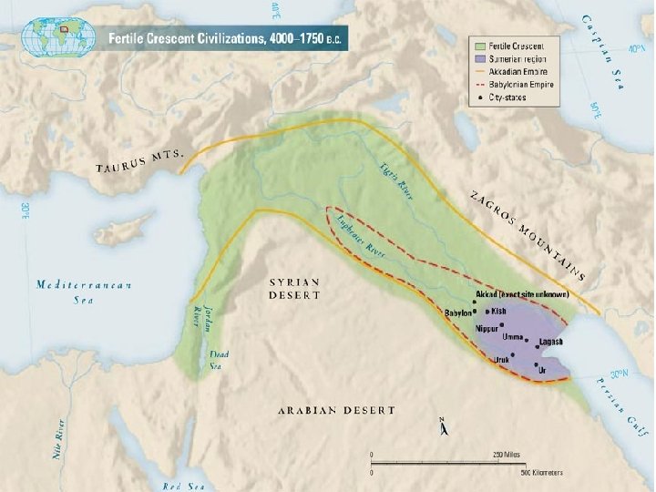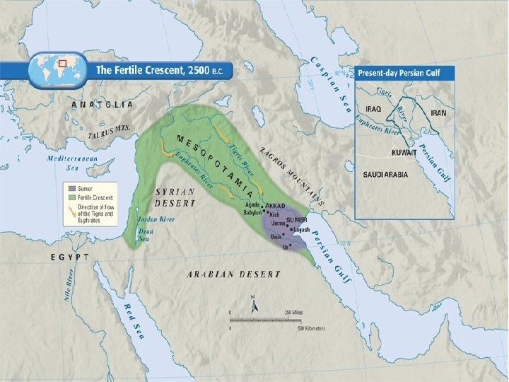 Geography of the Fertile Crescent • Between the Persian Gulf and the Mediterranean Sea is predominately desert • There is an arc of land though that provides some of the best farming in SW Asia • Since the region is curved and it is very fertile, it is referred to as the Fertile Crescent • It is located in Mesopotamia, which means ‘land between the rivers’