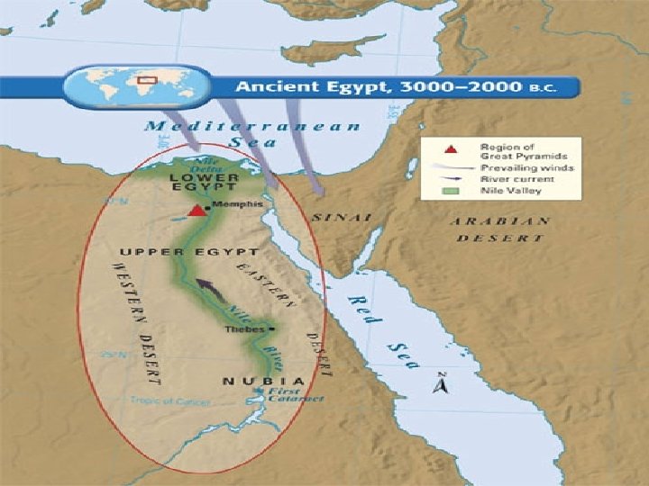 Geography • From the highlands of East Africa to the Mediterranean Sea, the Nile River flows northward across Africa for over 4, 100 miles – This is the longest river in the world • The land surrounding it was very fertile, but all around was desert – The change from fertile soil to desert, Black Land to Red Land, was so abrupt that a person could stand with one foot in each