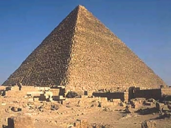 Pyramids Cont’d • Built by people who had not even begun to use the wheel yet • The Great Pyramid of Giza – Each stone weighted at least 2 ½ tons and some weighted up to 15 tons – More than 2 million blocks were stacked with precision to a height of 481 feet – The entire structure covered more than 13 acres