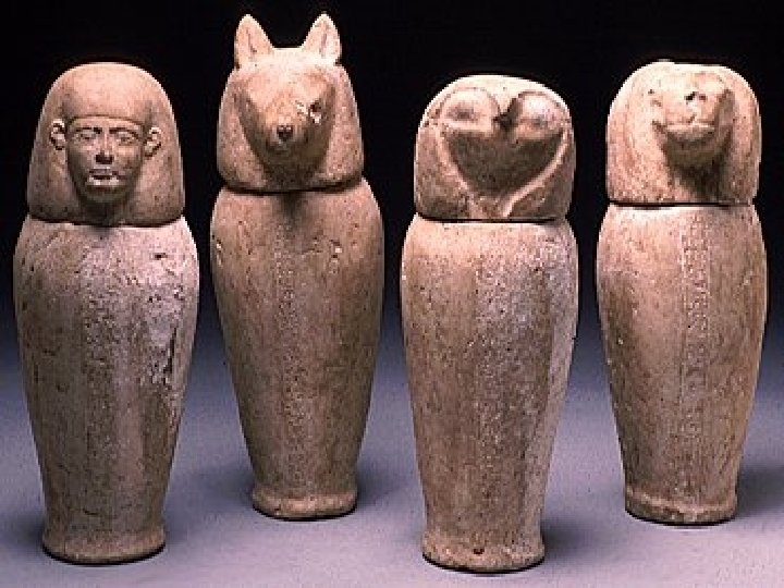 Religion Cont’d • Royal and elite Egyptians would be preserved by mummification, which involves embalming and drying the corpse to prevent decaying • Their important organs would be placed in Canopic jars • The tombs would be filled with items they thought they could use in the afterlife – Some even purchased scrolls that contained hymns, prayers, and magic spells intended to guide the soul in the afterlife • This collection is known as the Book of the Dead