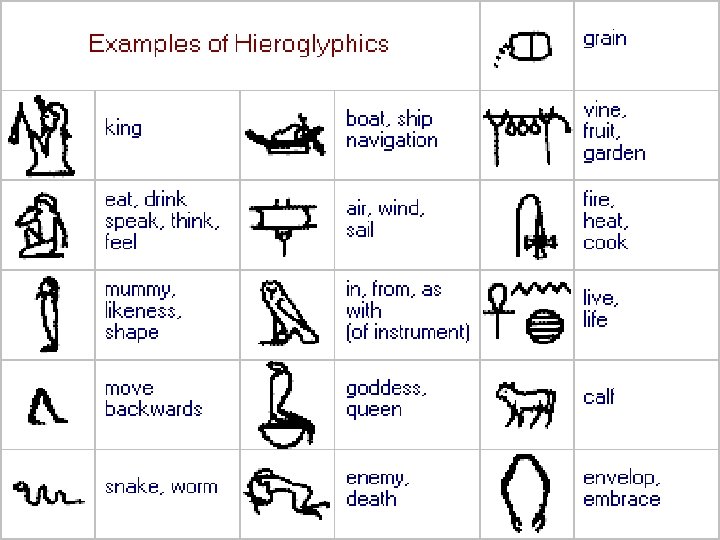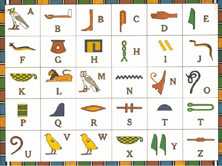 Writing • The Egyptians developed a form of writing known as hieroglyphics – meaning sacred carving – A picture stood for an idea • A picture of a man stood for the idea of a man – Later, pictures stood for sounds as well • The picture of an owl could mean the idea of an owl or for an m • They also invented a writing surface know as papyrus