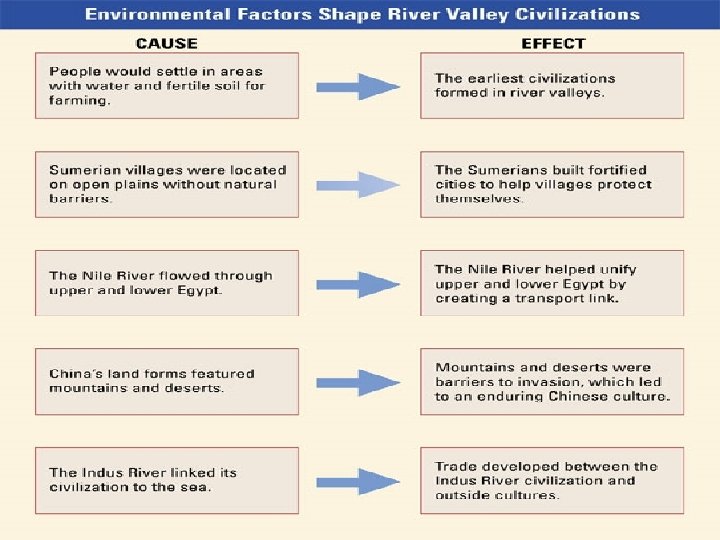 Environmental Challenges • Yearly floods spread deposits of rich soil over a wide area but they were unpredictable • At times, the rivers would change course • Cycles of wet and dry seasons (monsoons) were also unpredictable – If too much rain, it would wash entire villages – If too little rain, crops would die and people would go hungry