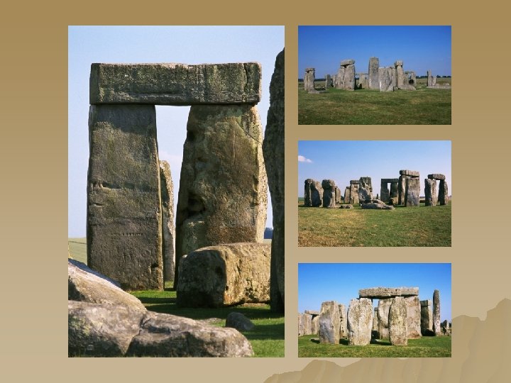 Megalithic Monument Types u Menhirs – simplest megalithic form, upright slabs that served as grave markers, parts of circles or made patterns.